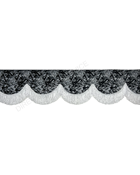 Exklusiv gardinkappa/pelmet i original Danish Plush, Grå med vita dubbla fransar. Extra tung dubbel-linad kvalitet, 250 cm lång och 12cm hög – perfekt för fönster, lastbilshytt eller husbil.