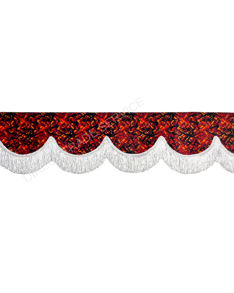 Exklusiv gardinkappa/pelmet i original Danish Plush, Röd med vita dubbla fransar. Extra tung dubbel-linad kvalitet, 250 cm lång och 12cm hög – perfekt för fönster, lastbilshytt eller husbil.