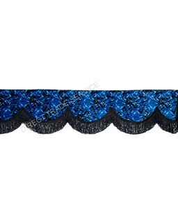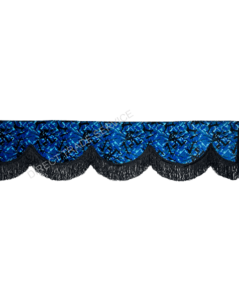 Exklusiv gardinkappa/pelmet i original Danish Plush, Blå med Svarta dubbla fransar. Extra tung dubbel-linad kvalitet, 250 cm lång och 18 cm hög – perfekt för fönster, lastbilshytt eller husbil.