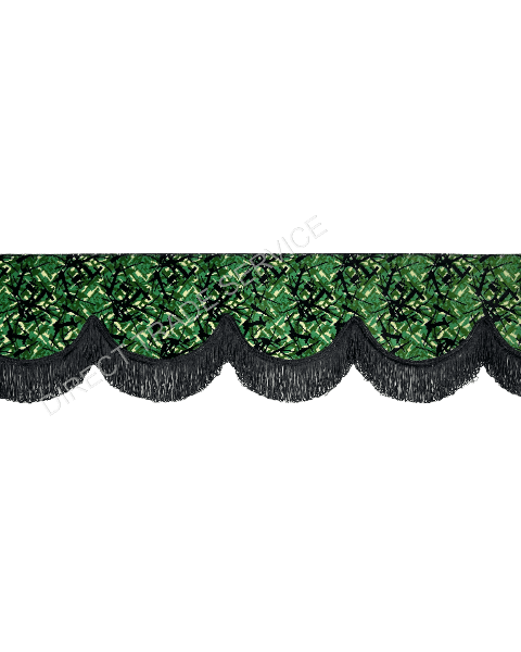 Exklusiv gardinkappa/pelmet i original Danish Plush, Grön med Svarta dubbla fransar. Extra tung dubbel-linad kvalitet, 250 cm lång och 18 cm hög – perfekt för fönster, lastbilshytt eller husbil.