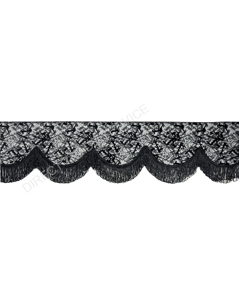 Exklusiv gardinkappa/pelmet i original Danish Plush, Grå med Svarta dubbla fransar. Extra tung dubbel-linad kvalitet, 250 cm lång och 18 cm hög – perfekt för fönster, lastbilshytt eller husbil.