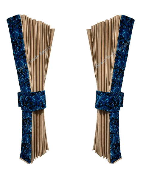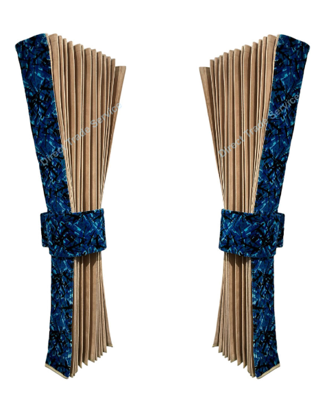Beige side curtain-set med blå Danish Plush-detaljer. Innehåller 2 sidogardiner och 2 omtag i dansk plysch – perfekt för lastbilshytt, husbil m.m