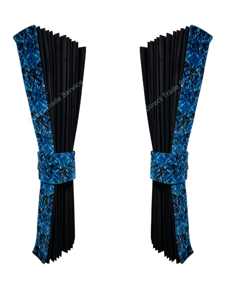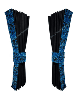 Svart side curtain-set med blå Danish Plush-detaljer. Innehåller 2 sidogardiner och 2 omtag i dansk plysch – perfekt för lastbilshytt, husbil m.m