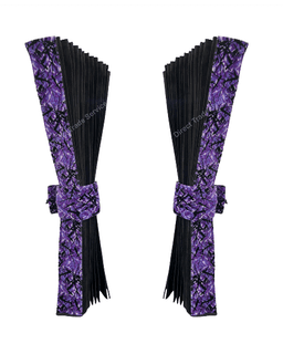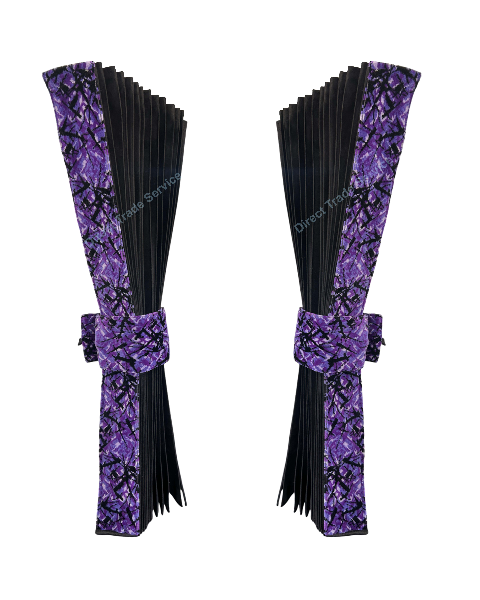 Svart side curtain-set med Lila Danish Plush-detaljer. Innehåller 2 sidogardiner och 2 omtag i dansk plysch – perfekt för lastbilshytt, husbil m.m