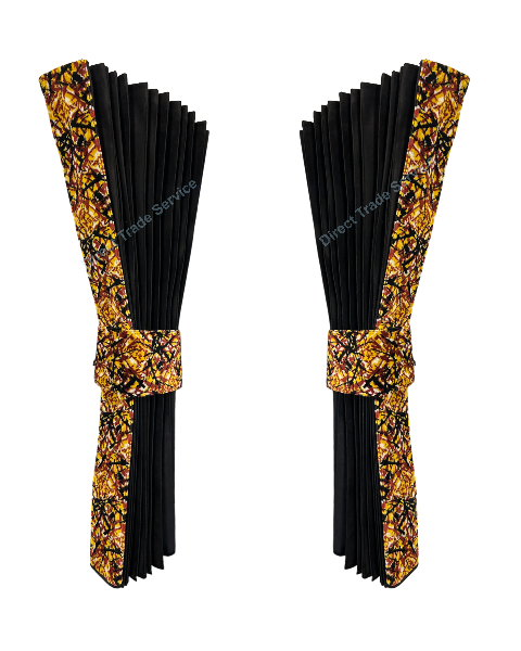 Svart side curtain-set med Gul Danish Plush-detaljer. Innehåller 2 sidogardiner och 2 omtag i dansk plysch – perfekt för lastbilshytt, husbil m.m