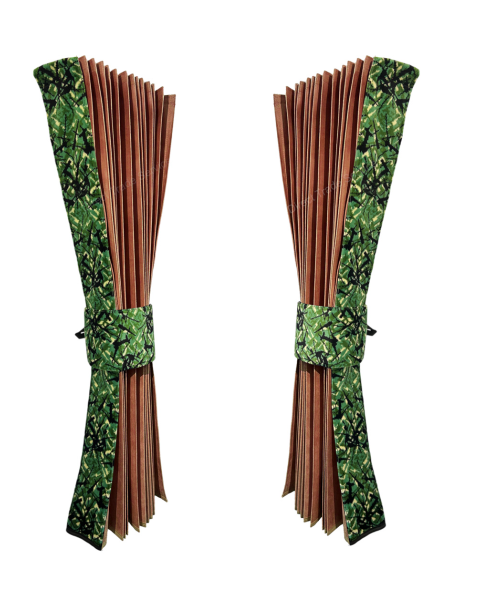 Brun side curtain-set med Grön Danish Plush-detaljer. Innehåller 2 sidogardiner och 2 omtag i dansk plysch – perfekt för lastbilshytt, husbil m.m