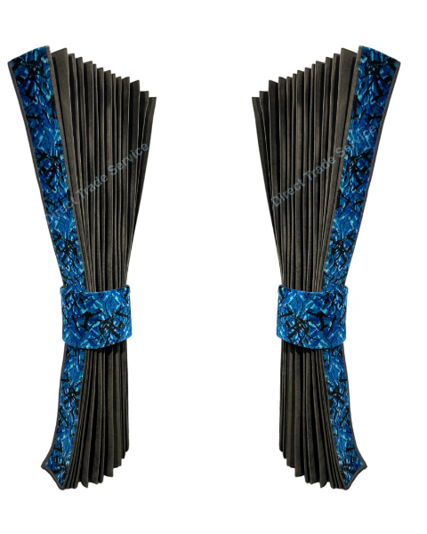 Grå side curtain-set med Blå Danish Plush-detaljer. Innehåller 2 sidogardiner och 2 omtag i dansk plysch – perfekt för lastbilshytt, husbil m.m